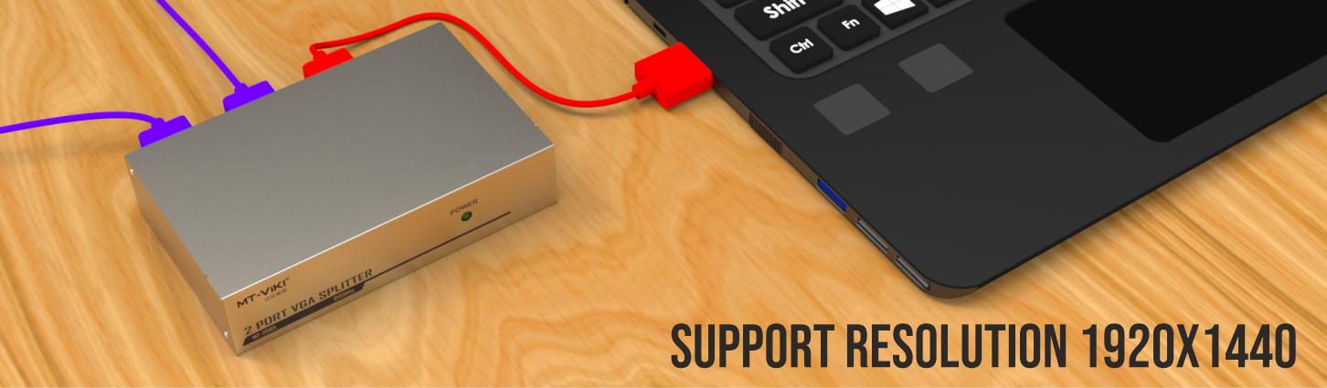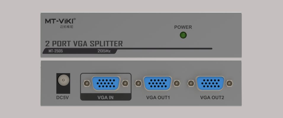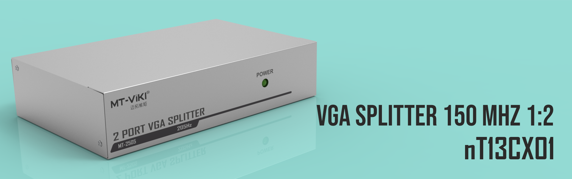 The VGA video splitter that distributes one video signal to multiple displays. This 1 in 2 out 250 MHz VGA splitter that can output one VGA source into two VGA displays. The resolution can also reach 1920*1440. This series of VGA splitters, MT-VIKI?can provide 2/4/8 ports, while the bandwidth is 150MHz, 250MHz, 350MHz, 500MHz variety of VGA splitters. These splitter can greatly reduce the cost, plug and play, simple and convenient.