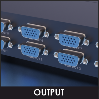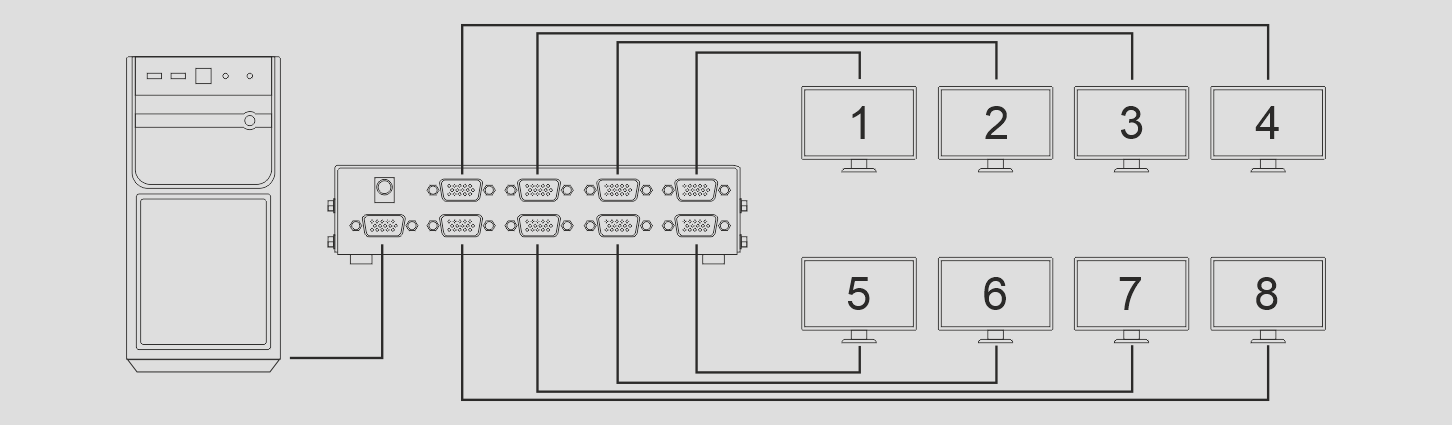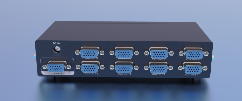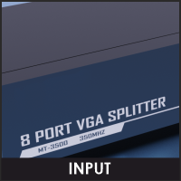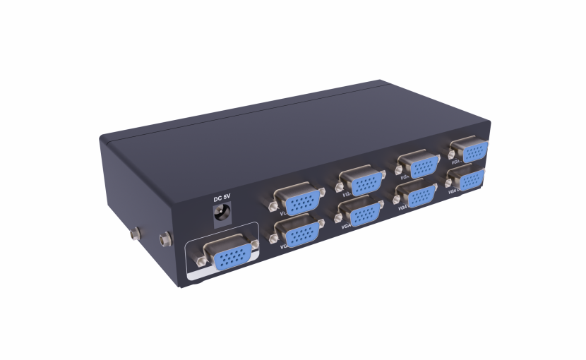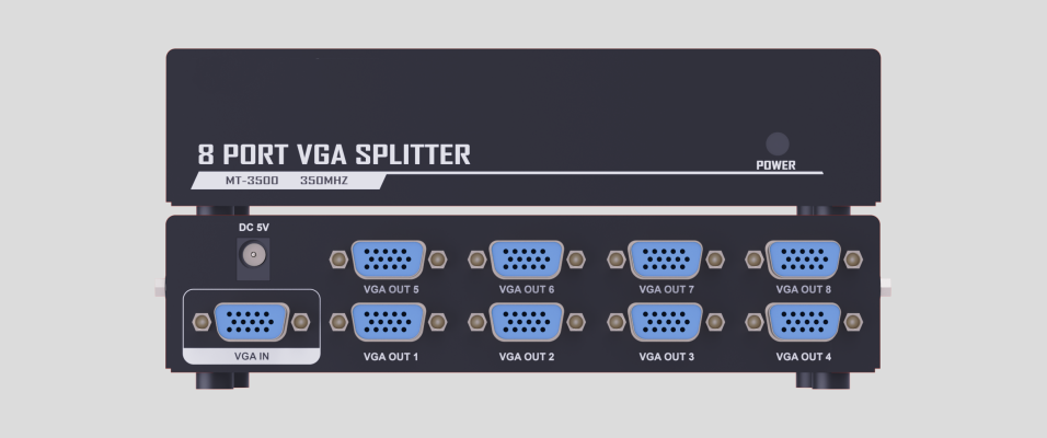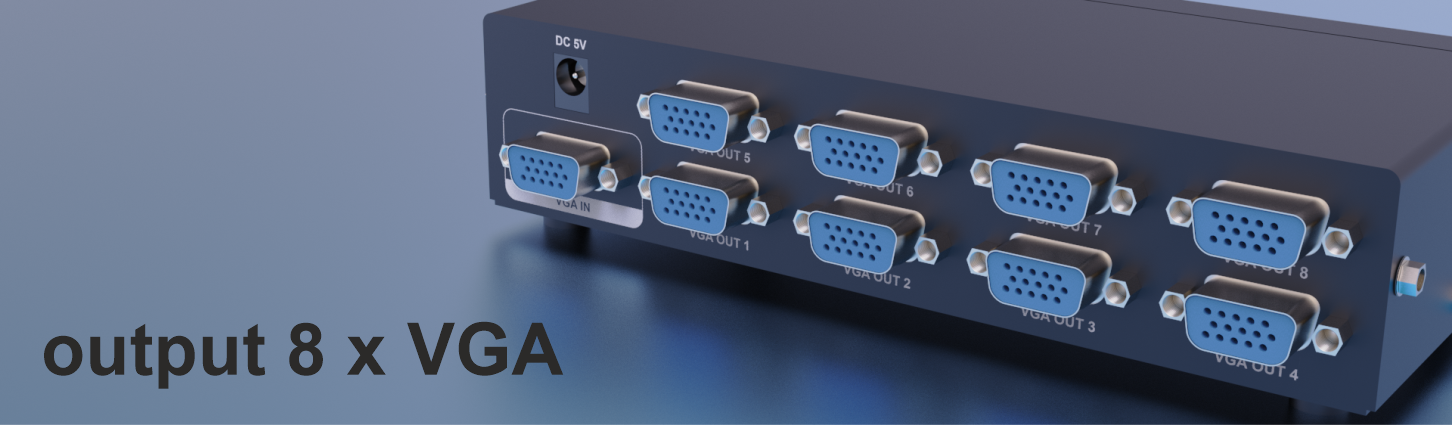 The VGA video splitter that distributes one video signal to multiple displays. This 1 in 8 out 350 MHz VGA splitter that can output one VGA source into Eight VGA displays, 8 displays device will show the same picture. The resolution can also reach 1920*1440. These splitter can greatly reduce the cost, plug and play, simple and convenient.