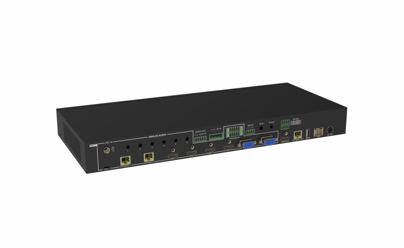 This 9 by 2 multi-format scaling switcher provides HDMI, USB Type C, HDBaseT, and VGA inputs which can be freely selected for output at a scaled resolution of the user’s choosing over the mirrored HDMI and HDBaseT outputs. The HDMI and USB-C ports support resolutions up to 4K@60 (4:4:4, 8-bit) while the HDBaseT output supports automatic down-conversion of 4K60(4:4:4) sources to 4K60(4:2:0). The VGA inputs support resolutions up to WUXGA. The HDBaseT output provides a great solution to extend your audio and video up to 70 meters (at 4K) over a single run of Cat.5e/6/7 cable as well as providing 48V PoH power to compatible HDBaseT Receivers. This unit also includes multiple analog stereo audio inputs and a microphone input along with an amplified analog stereo output to provide a range of audio routing and mixing flexibility. The built-in audio mixer function allows the user to mix audio from any analog input with the microphone input for presentation or lecture usage. The ability to switch back and forth between mixed and nonmixed audio greatly simplifies the presentation experience. A trigger input interface is also provided to allow the easy addition of a remote control keypad, or other trigger-supporting products, which can be installed within a podium or within a table in a conference room or classroom. This interface can allow the user to activate functions with the simple press of a button. Standard control is available via front panel buttons with an On-Screen Display (OSD), WebGUI, IR remote, Telnet, and RS-232 making it exceptionally versatile
