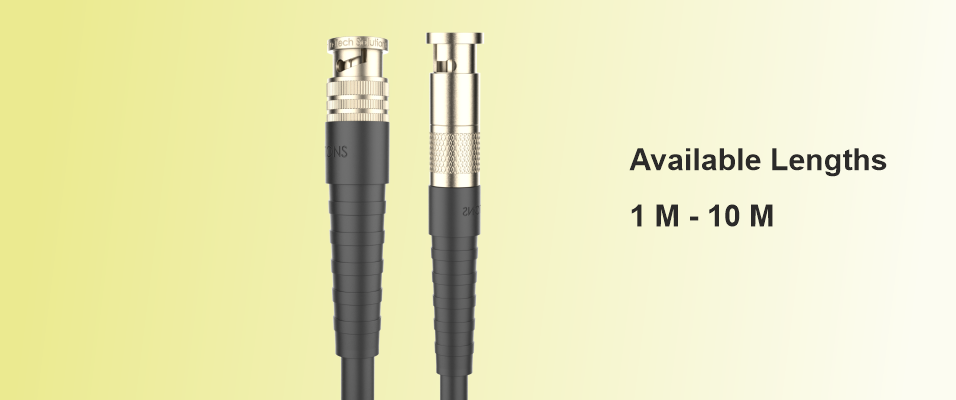 SDI M to SDI High Density BNC M cable is made of slim SDI Cable , the cable supports 12G Signals . The cable supports connection between normal BNC to High Density BNC devices . BNC Connector and High Density BNC Connectors are made of Brass and teflon material . The connectors are nickel coated and pin is gold plated . The connectors and cables are 75 ohms and supports up to 12 G Signals and resolutions up to 4k 60 Hz . The connectors are machine crimped to the cable . The coaxial cable conductor is 23 awg and shielding is 95% coverage for the best performance . Colour : Black . Available Length 1 – 10 Mtrs .